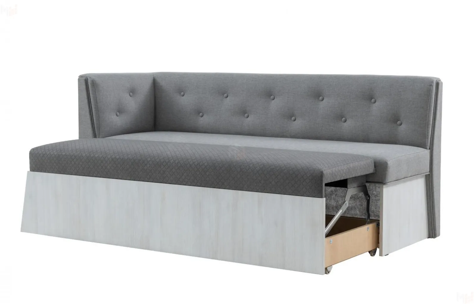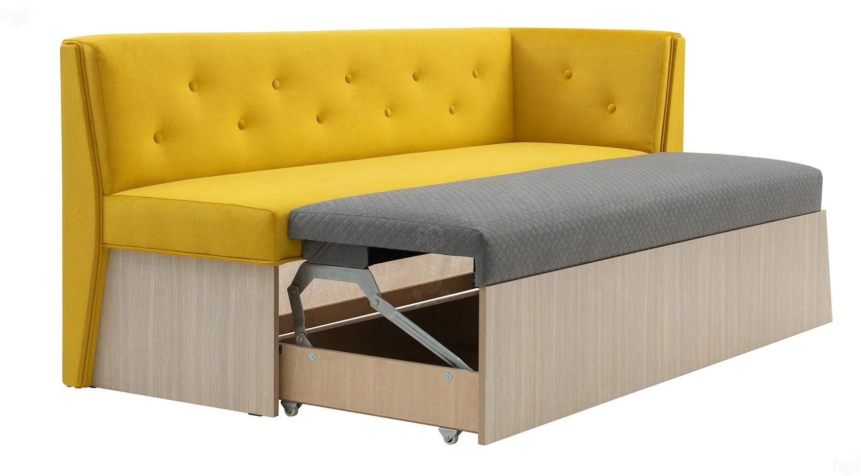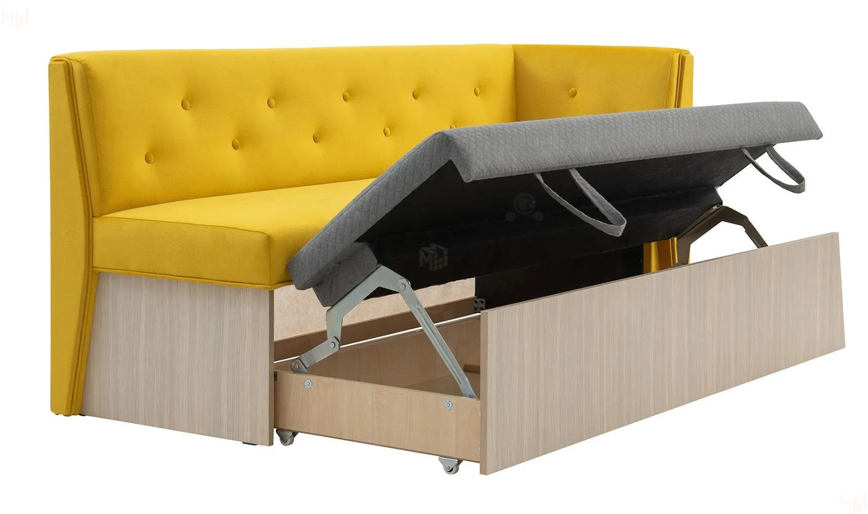 Нижняя часть дивана выполнена из ЛДСП, который очень практичен в использовании и отлично сочетается с предметами мебели. Оптимальная высота и глубина дивана позволят удобно разместиться человеку любого роста, а угловая часть дивана позволит комфортно отдыхать в течение дня, не раскладывая диван. В качестве наполнителя используется ППУ повышенной комфортности с одновременным сочетанием мягкости и упругости.