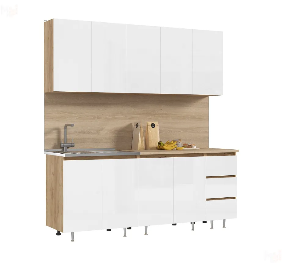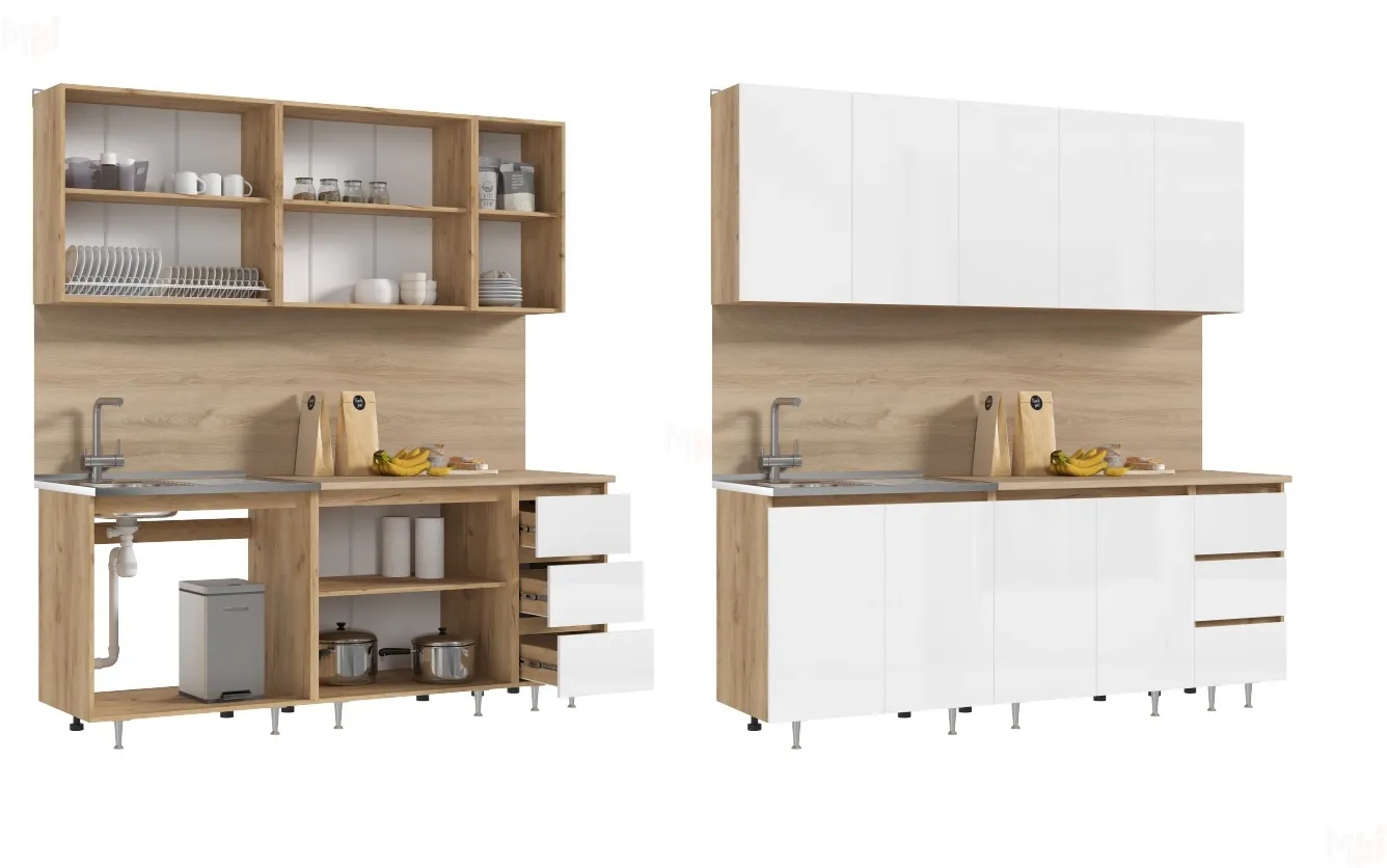 Каркас выполнен из ЛДСП 16 мм цвета Дуб крафт золотой, фасады ЛДСП Белый. Столешница дуб вотан 26 мм.