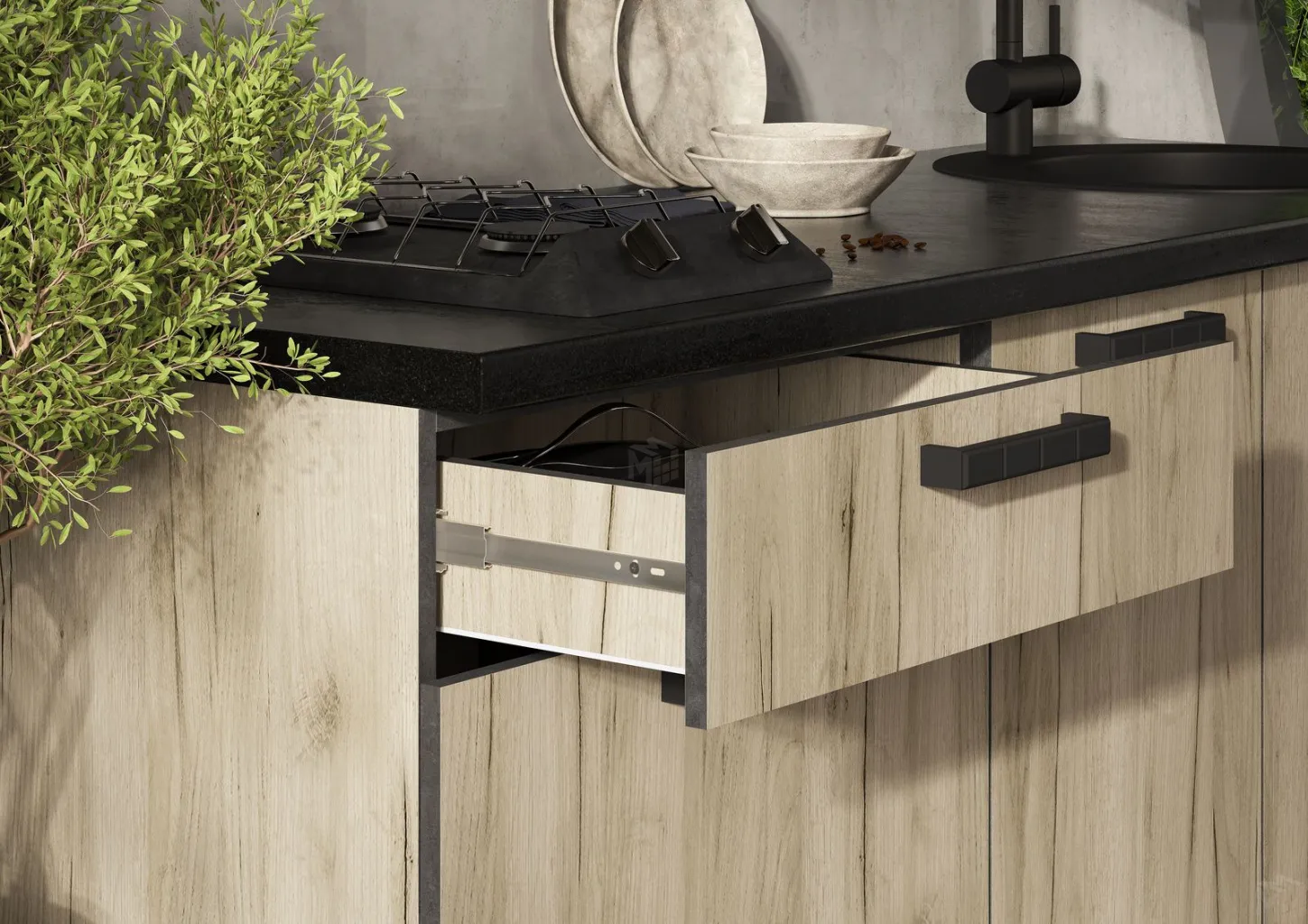 Корпус кухни выполнен из ЛДСП Железный камень, фасады ЛДСП Крафт серый.