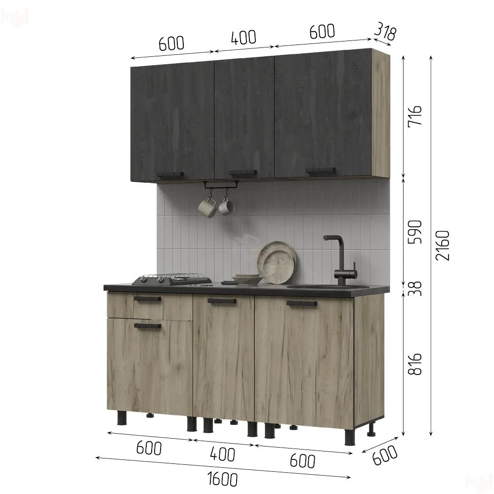 Габариты нижних модулей - ширина 1600 мм, высота с опорами и столешницей 854 мм, глубина по столешнице 600 мм.