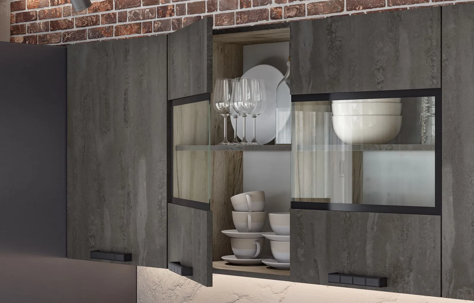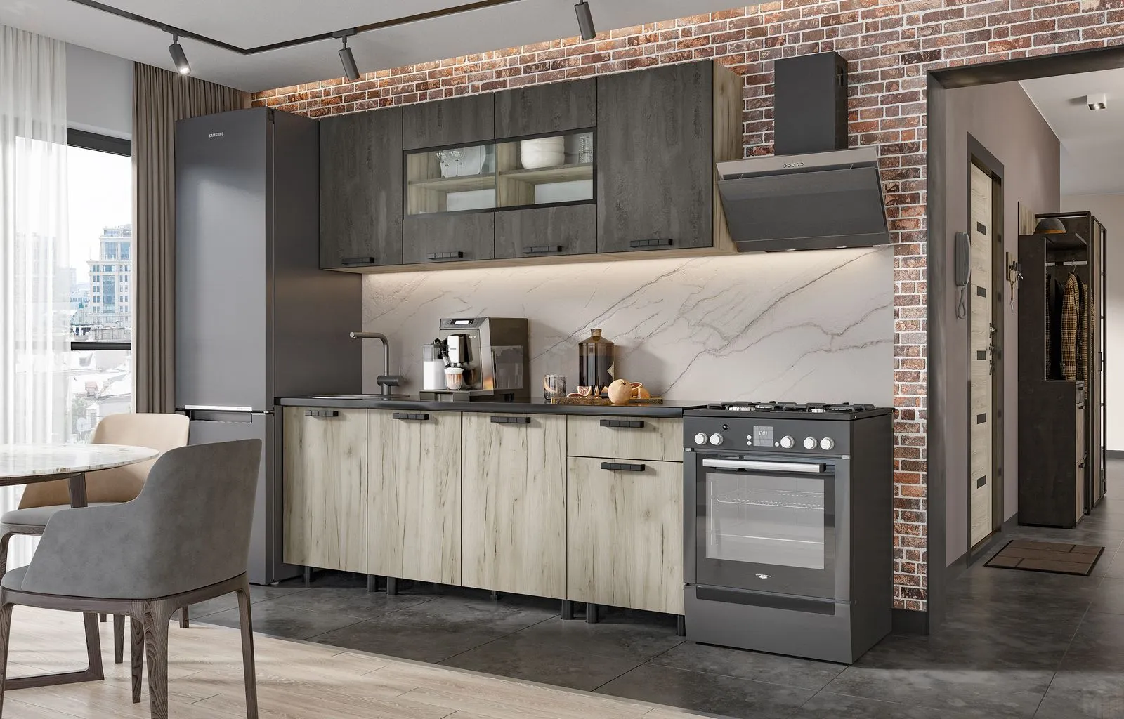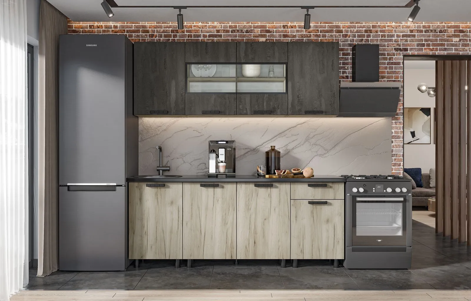 Корпус кухни выполнен из ЛДСП Железный камень, фасады ЛДСП Крафт серый.
