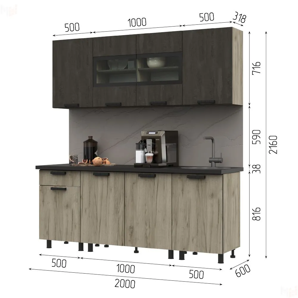 Габариты нижних модулей - ширина 2000 мм, высота с опорами и столешницей 854 мм, глубина по столешнице 600 мм.