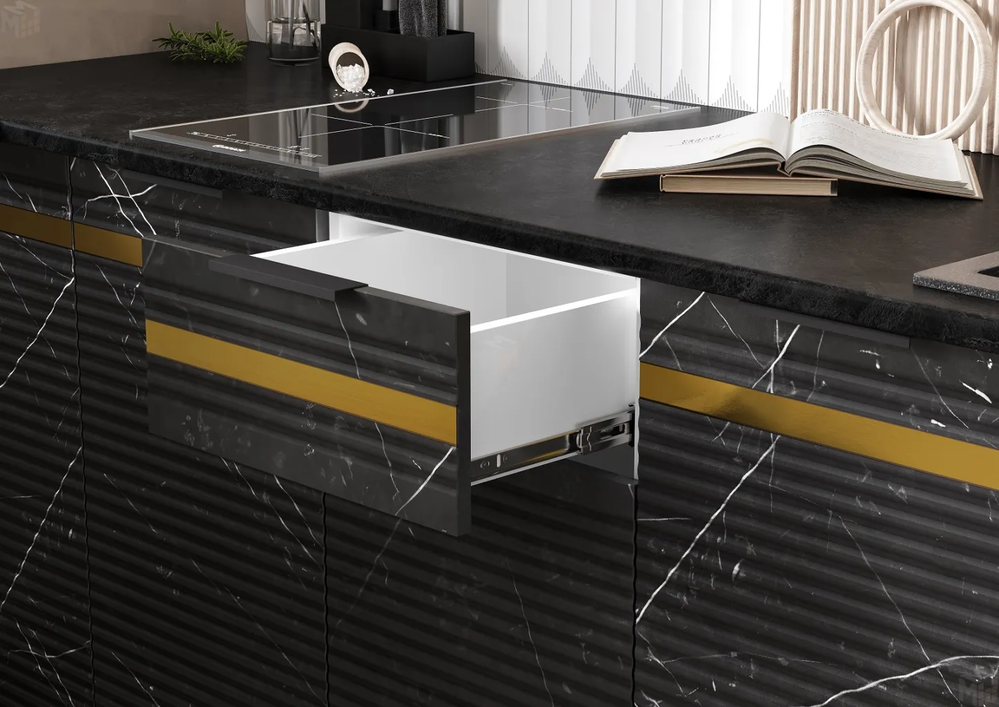 Фасад МДФ с пленкой ПВХ, цвет мрамор белый софт/мрамор блэк софт, вставка металлический молдинг.