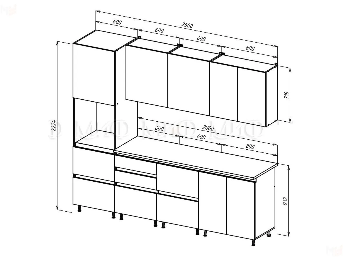 ширина 2600 мм, глубина 600 мм, высота 2224 мм