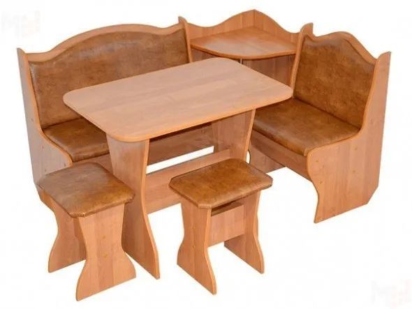 Комплект: скамья угловая + стол + 2 табурета. Размеры: скамья 1450*1100*850 мм., стол 900*600*730мм., табурет 380*320*420мм.