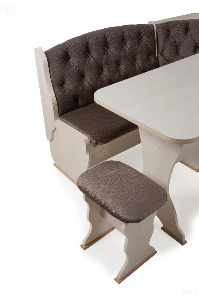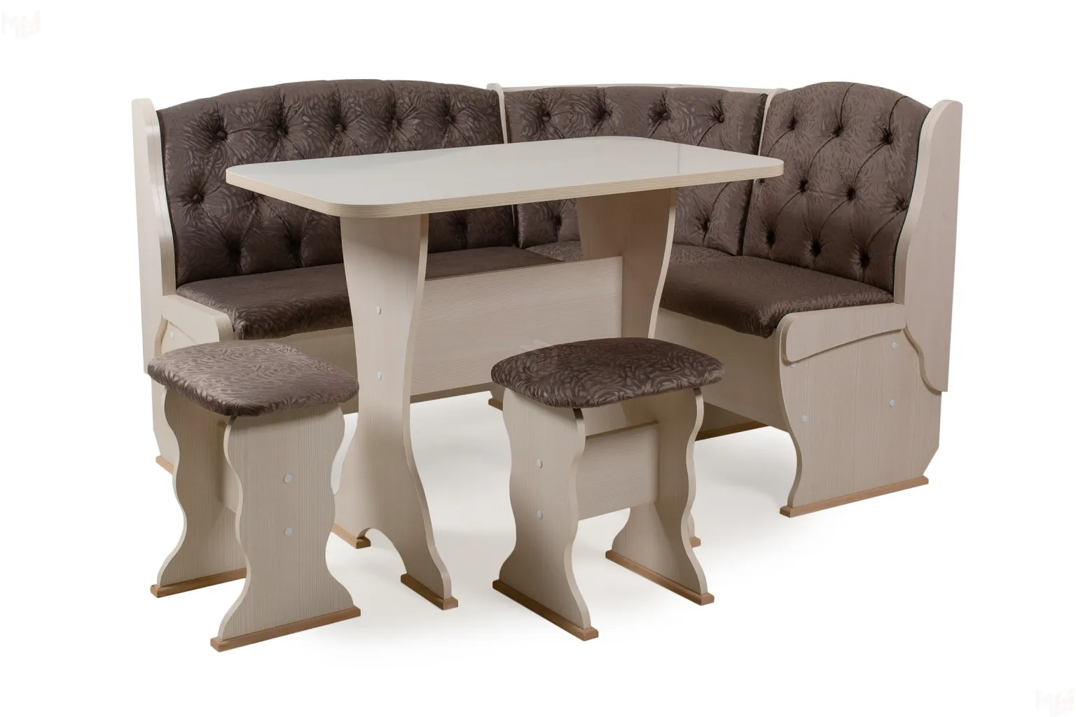 Кухонный уголок с двумя ящиками для хранения. Каркас из ЛДСП бодега, обивка флок графит. Покрытие столешницы термостойкий пластик. Современная и функциональная модель.