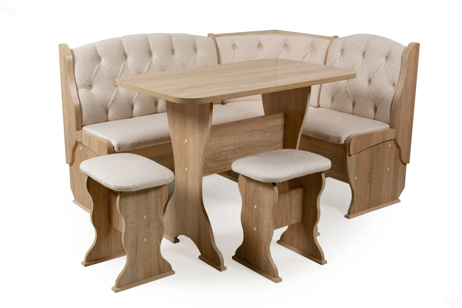 Кухонный уголок с двумя ящиками для хранения. Каркас из ЛДСП дуб сонома, обивка флок карамель. Покрытие столешницы термостойкий пластик. Современная и функциональная модель.