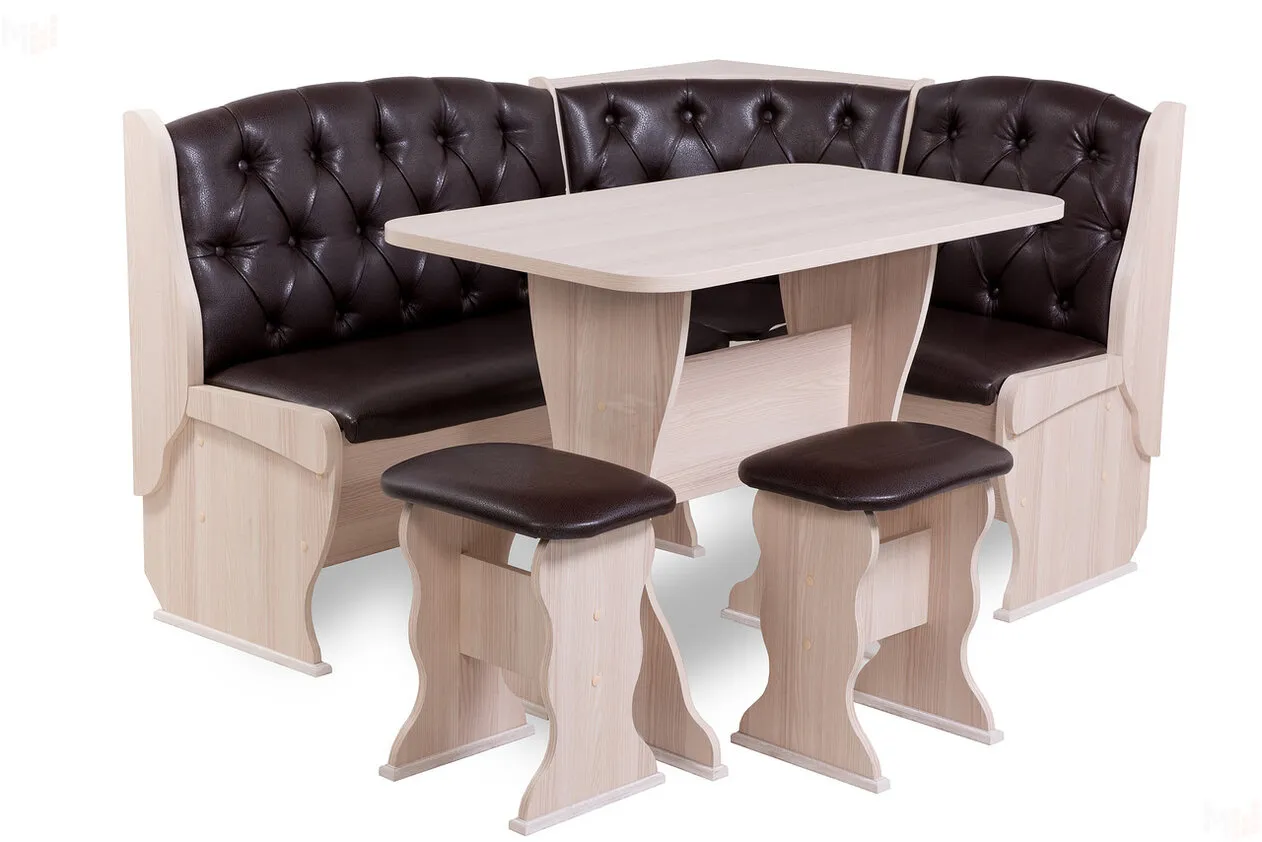 Оригинальный дизайн гарнитура станет украшением Вашей кухонной зоны и местом встреч для семейных вечеров за чашечкой горячего напитка. Угловую скамью можно собрать как в правом, так и в левом исполнении.