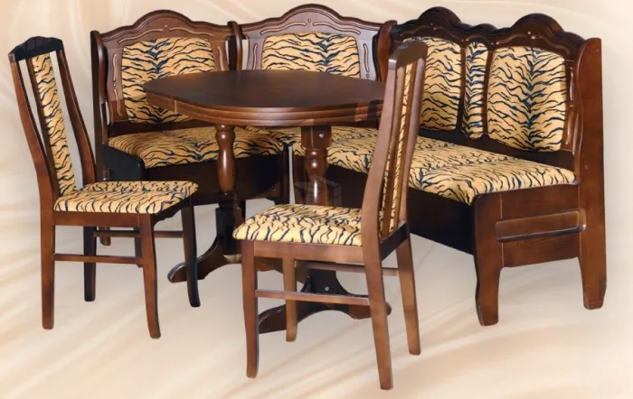 Столешница стола изготовлена из шпона березы, а ножки стола, табуретки и каркас уголка произведены из соснового массива. Данный привлекательный мебельный комплект можно удачно разместить даже на небольшом кухонном пространстве. Приятные классические цвета изделия наверняка придутся по душе многим покупателям, желающим приобрести качественный и практичный кухонный гарнитур. В случае необходимости столешницу можно разложить, а угол расположить на любую сторону.