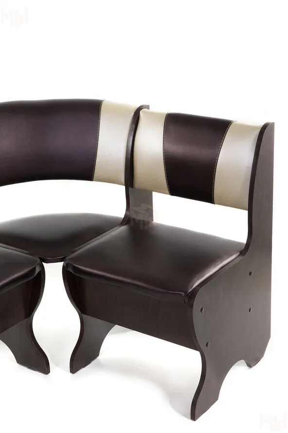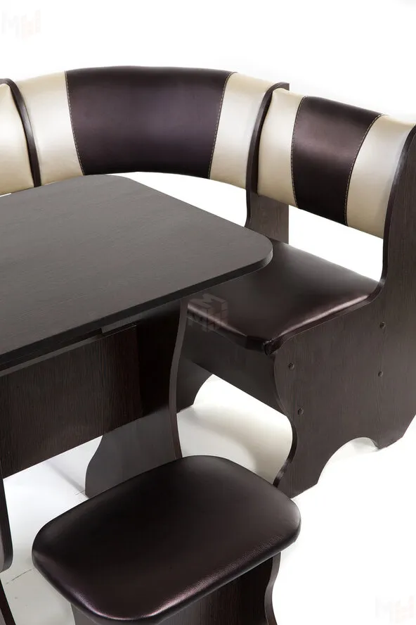 Кухонный уголок небольшого размера (100*100 см) с двумя ящиками под сидениями. Корпус выполнен из ЛДСП венге, обивка кожзам Барнео умбер. Глубина уголка от стены 500 мм.