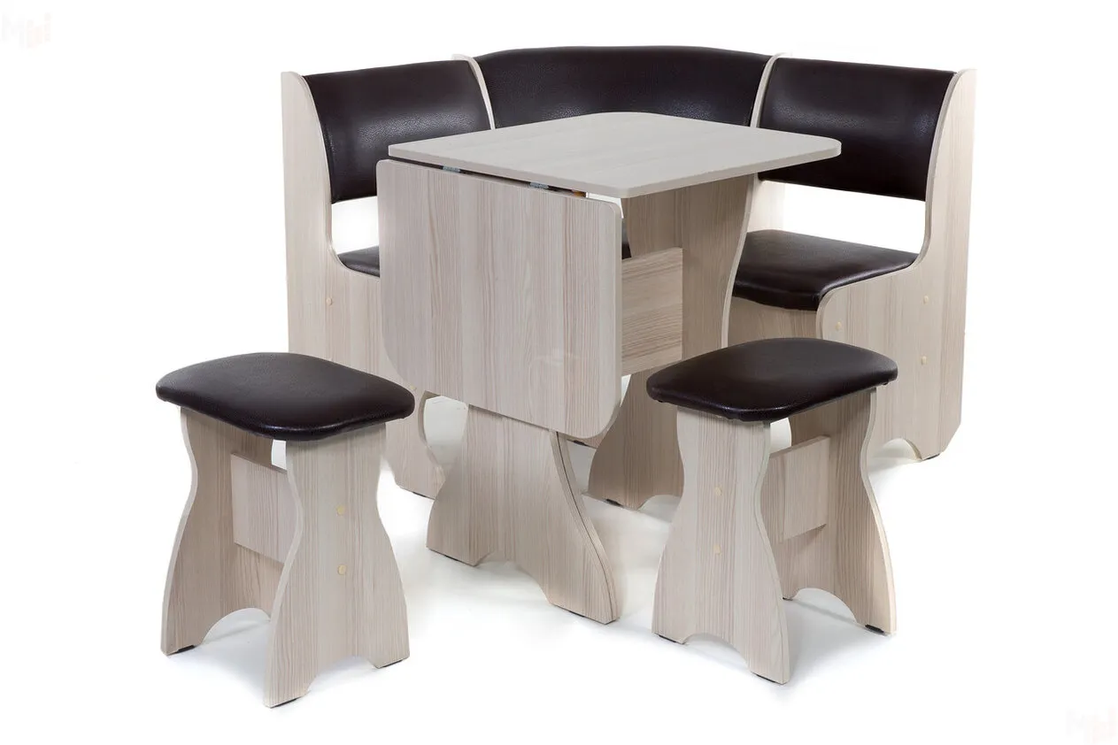 Кухонный уголок небольшого размера (100*100 см) с двумя ящиками под сидениями. Корпус выполнен из ЛДСП ясень, обивка кожзам Барнео умбер. Глубина уголка от стены 500 мм.