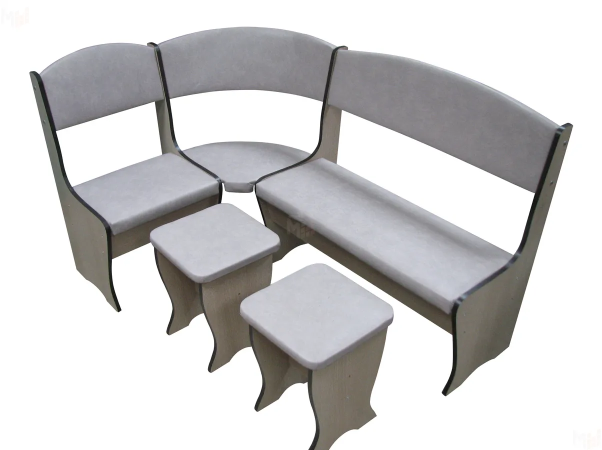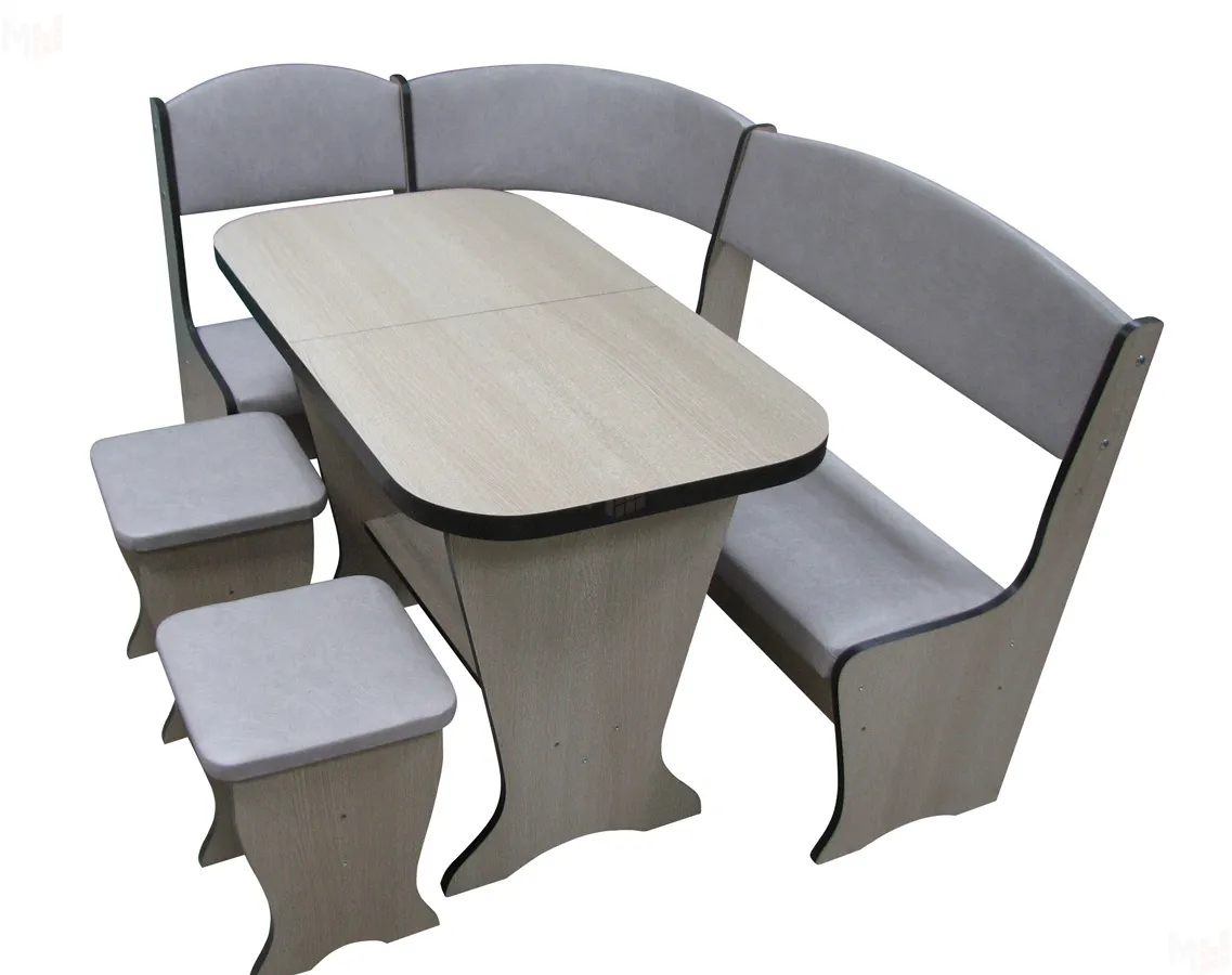 В море кухонной мебели привлекает внимание округлыми линиями и спокойным тоном отделки уголок Весна с раскладным столом. Каркас мебели сделан из ДСП цвета дуб беленый, кромка черная. Спинка скамьи изогнута и удобна для положения спины. Модель выпускается с обивкой из практичного кожзаменителя. Ящик под сиденьем пригодится вам для хранения всяких мелких предметов. Размеры дивана 1460*1010 мм, имеет вариант сборки на любую сторону. Входящий в комплект кухонного уголка Весна, оригинальный раздвижной стол удобен во время семейного обеда. В раздвинутом виде он имеет размеры 1300*574мм, в собранном виде длина стола 1050 мм. Два мягких табурета, с мягкими сиденьями, проверенные конструкторами на устойчивость выгодно дополняют ансамбль. Такой уголок найдёт применение в кухне с любым дизайном. Очень оригинально такой ансамбль будет смотреться на дачной веранде.