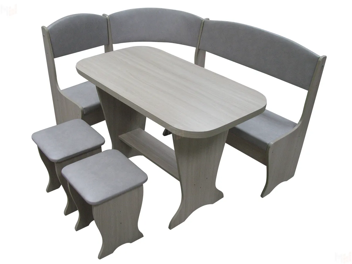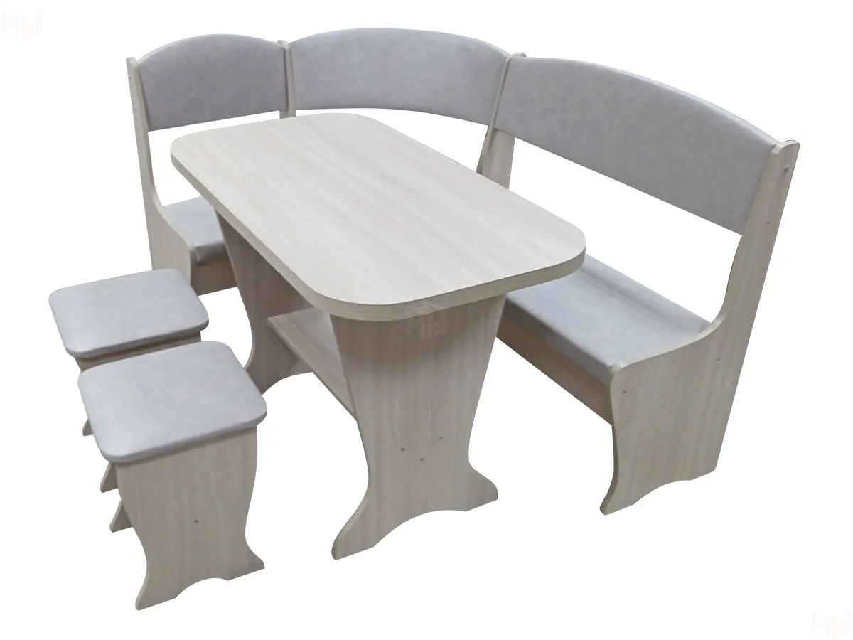 В море кухонной мебели привлекает внимание округлыми линиями и спокойным тоном отделки уголок Весна с раскладным столом. Каркас мебели сделан из ДСП цвета ясень шимо. Спинка скамьи изогнута и удобна для положения спины. Ящик под сиденьем пригодится вам для хранения всяких мелких предметов.