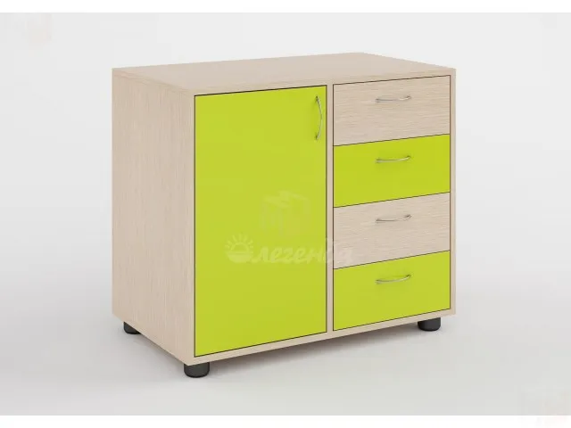 Интересное дизайнерское решение – разделить комод Л-02 на 4 четверти. Слева – это две вместительные глубокие открытые полки с дверями, справа – 4 выдвижных ящика с удобными ручками. Колёса позволяют без труда передвигать тумбу, даже заполненную вещами. Если Вы предпочитаете однотонную мебель, то Ваш вариант расцветки – венге светлый. А также можно сделать цветовой акцент, выделив два фасада ящиков подходящим цветом.