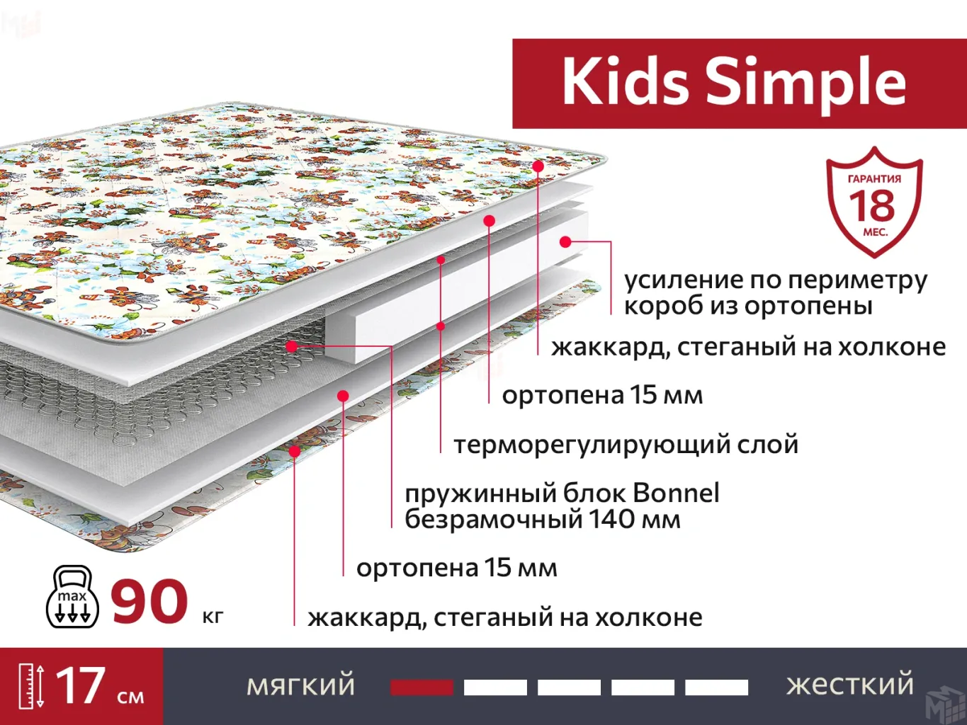 Kids Simple – матрас, в основе которого лежит классический пружинный блок Боннель, создающий ровную спальную поверхность и оказывающий поддерживающий эффект.