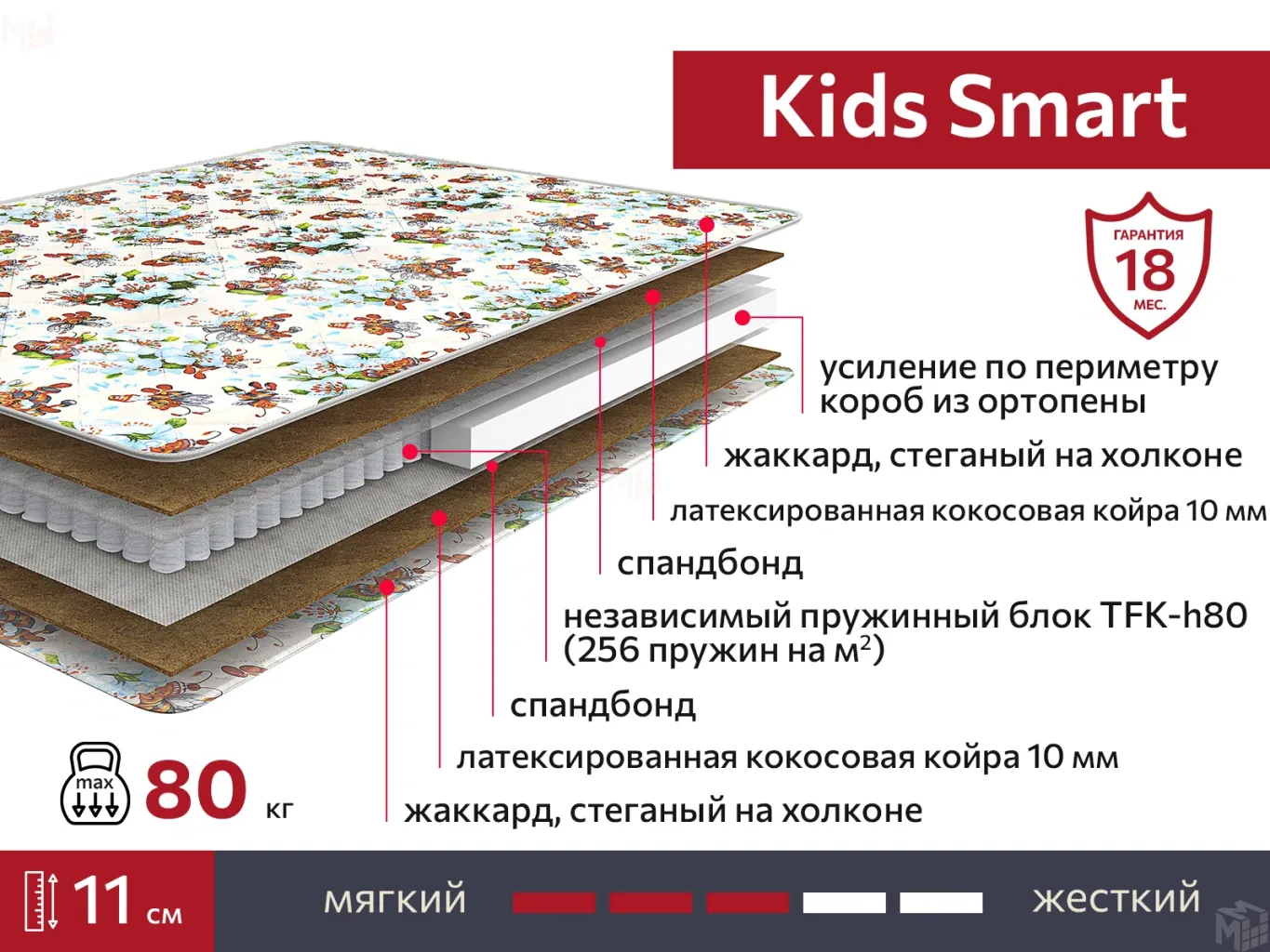 Двухсторонний матрас KIDS SMART TFK – средней жёсткости. Независимые пружины и слой кокосовой койры обеспечивают хорошую поддержку и формирование правильной осанки в течение всего периода пользования матрасом.