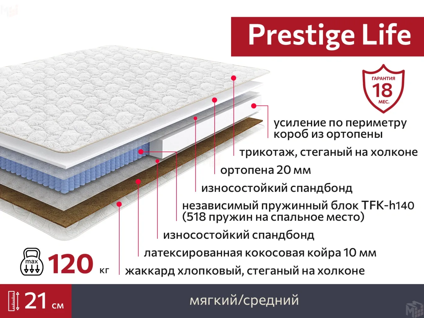 В модели Prestige Life (зима-лето) используются разные наполнители и материалы: для теплой, зимней стороны – мягкая ортопена и трикотаж, который идеально сохраняет тепло; для холодной, летней – латексированная кокосовая койра и прохладный на ощупь жаккард, отличающийся долговечностью и прочностью. Для простоты “опознания” стороны на матрасе есть символы “снежинка” и “солнышко”.