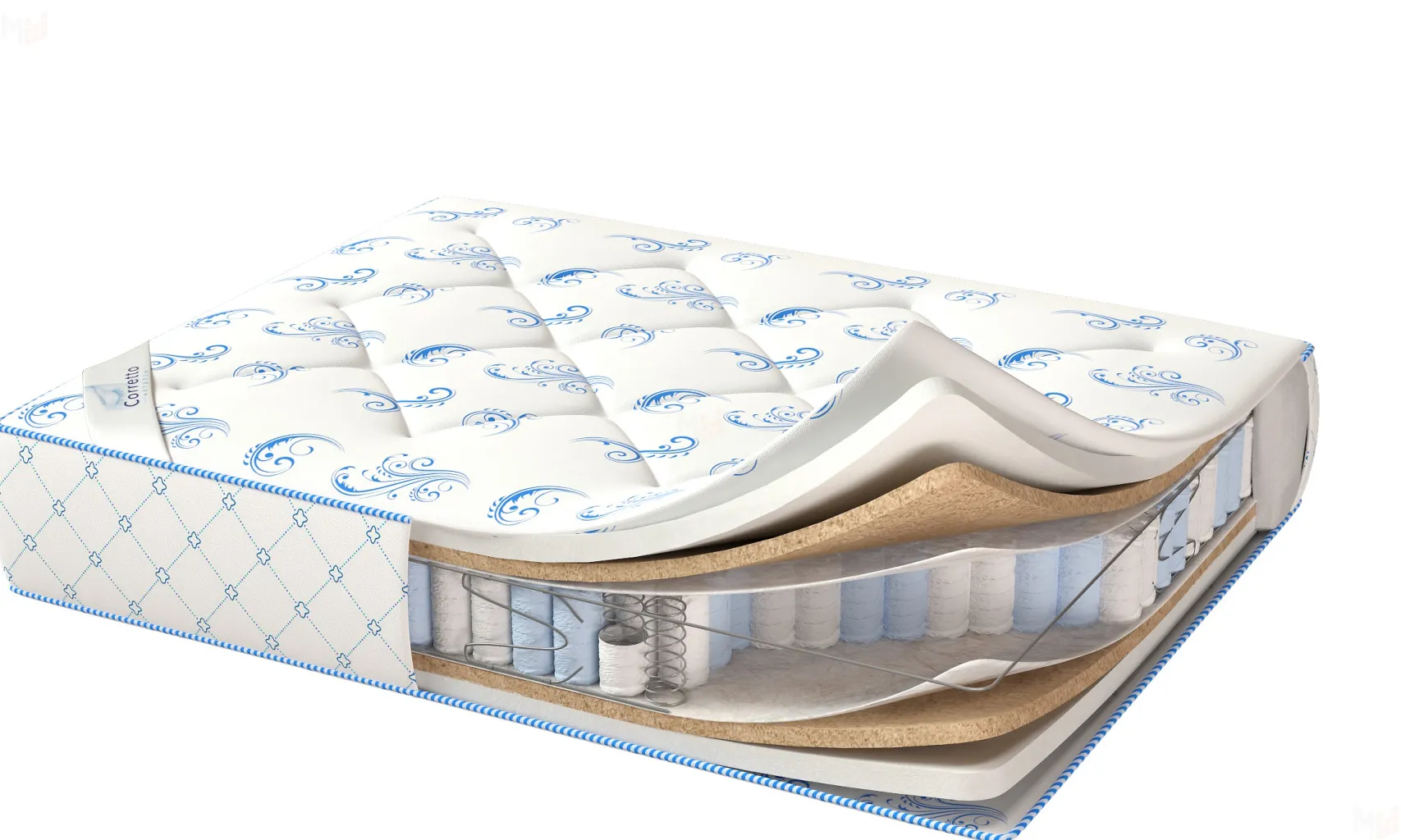 В состав его входит: спанбонд, толстый слой пенополиуретана, кокосовая койра 10 мм. Все это "матрасное великолепие" обрамляет чехол из простеганного на синтепоне хлопка. Приобретая "Relax", покупатель получает высококачественный продукт фабрики CORRETTO.