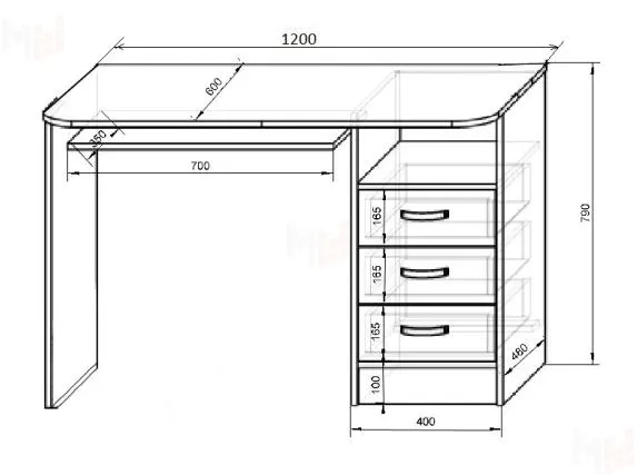 - стол письменный 13/1 с встроенной тумбой (три ящика). Модуль - универсальный. Стол оснащен выдвижной полкой для клавиатуры.