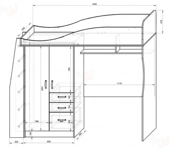 Кровать-чердак: 1890х1932х840 мм. Спальное место 1900х800 мм.