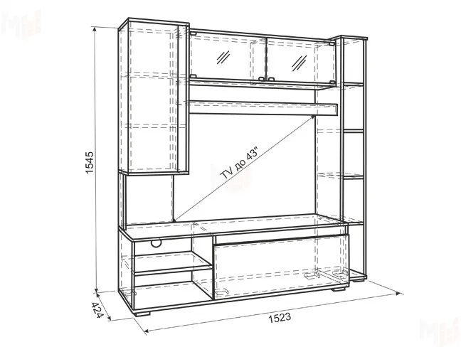Состоит из: открытых полок, закрытых полок, полок за стеклом, ниши под телевизор.