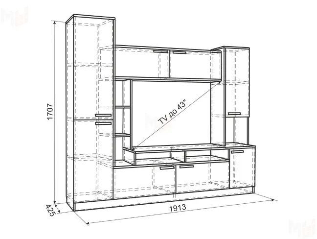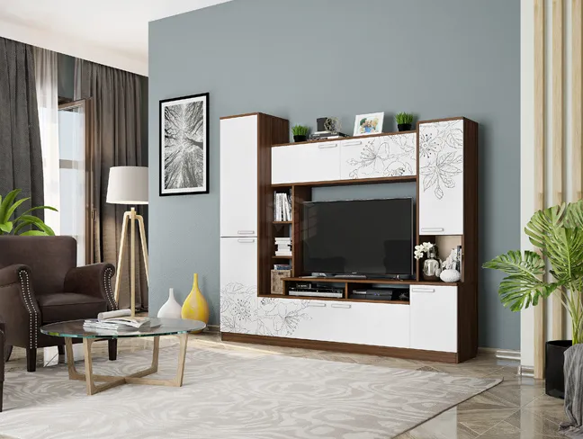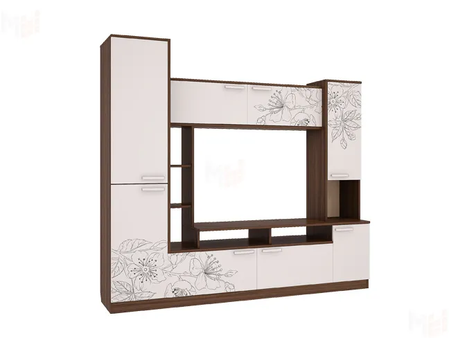 Мини-стенка «Токио»- находка для Вашей гостиной! Благодаря наличию большого количества открытых и закрытых полок, она заменит Вам полноценную стенку. Предусмотрено место для ТВ диагональю до 43 дюймов. Принтерный рисунок устойчив к воздействию ультрафиолета и истиранию. Качественная фурнитура порадует Вас долговечностью.