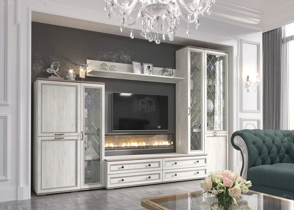 Модульная система «Александрия» выполнена в стиле Неоклассика. Рамочные фасады с патиной, толстая плита верхней и нижней крышек модулей, стекла с алмазной гравировкой, направляющие и петли с доводчиками, металлические ручки, все это создает в ощущение продукта премиального качества. Огромный модульный ряд коллекции, позволит обставить любое жилое помещение.