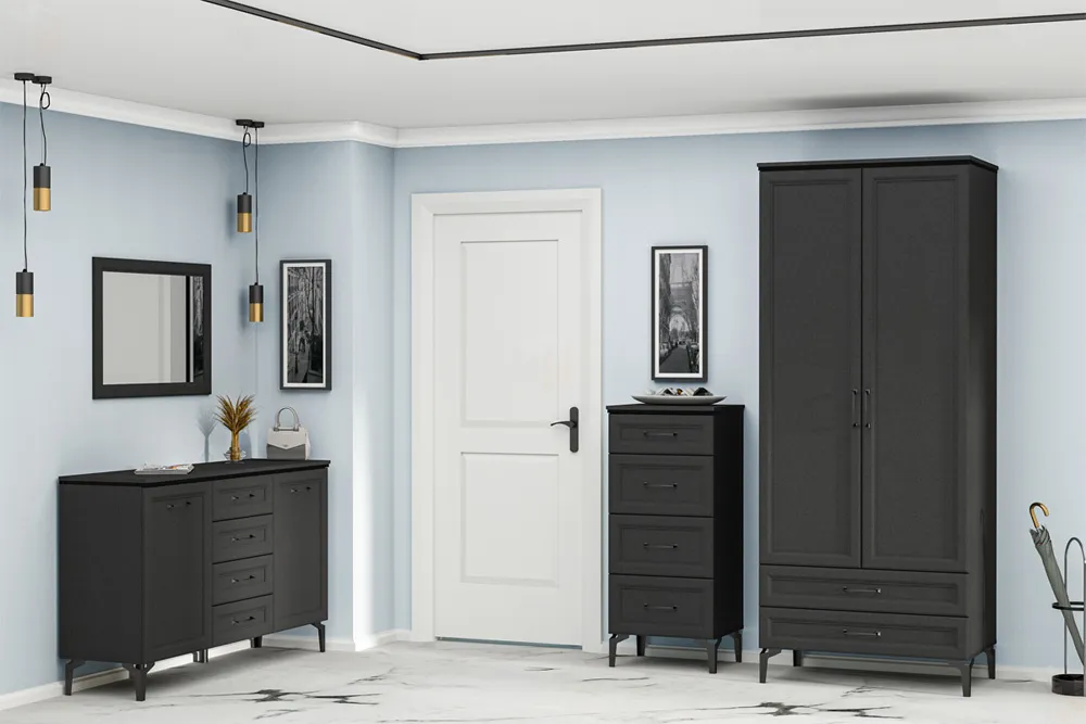 - Шкаф ШК-2 (910х2220х580 мм). За распашными дверями - полки и металлическая штанга для одежды, внизу - два выдвижных ящика.
