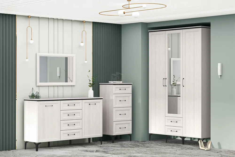 - Шкаф ШК-3 (1360х2220х580 мм). Внутреннее наполнение: две крайние секции со штангой для одежды и полкой, средняя секция с тремя полками и двумя ящиками.