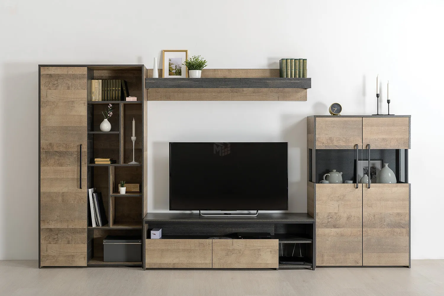 Гостиная Трувор (вариант 1) поможет создать уютную обстановку в вашей гостиной. Теперь у вас будет уютная комната, в которой вы сможете проводить свободное время со своей семьей или друзьями. Тумба поможет разместить телевизор для более комфортного просмотра новостей, сериалов и различных телепередач. Открытые ниши предназначены для необходимой аппаратуры. Навесная полки и полки стеллажа созданы для бережного хранения наборов красивой посуды, интересных и увлекательных книг, семейных фотоальбомов, коллекции интересных предметов, оригинальных сувениров, статуэток, детских поделок и многого другого. За глухой дверцей можно хранить более ценных и важные предметы, а также одежду и белье. Индустриальная мебель Трувор выполнена в стиле лофт.