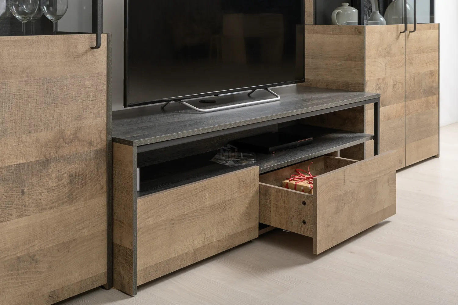 Лицевая фурнитура с тем же покрытием придаёт мебели индустриальную эстетику.Все петли и направляющие оснащены доводчиками. Светодиодная подсветка в витринах с тонированным стеклом — эффектно подчёркивает аксессуары.