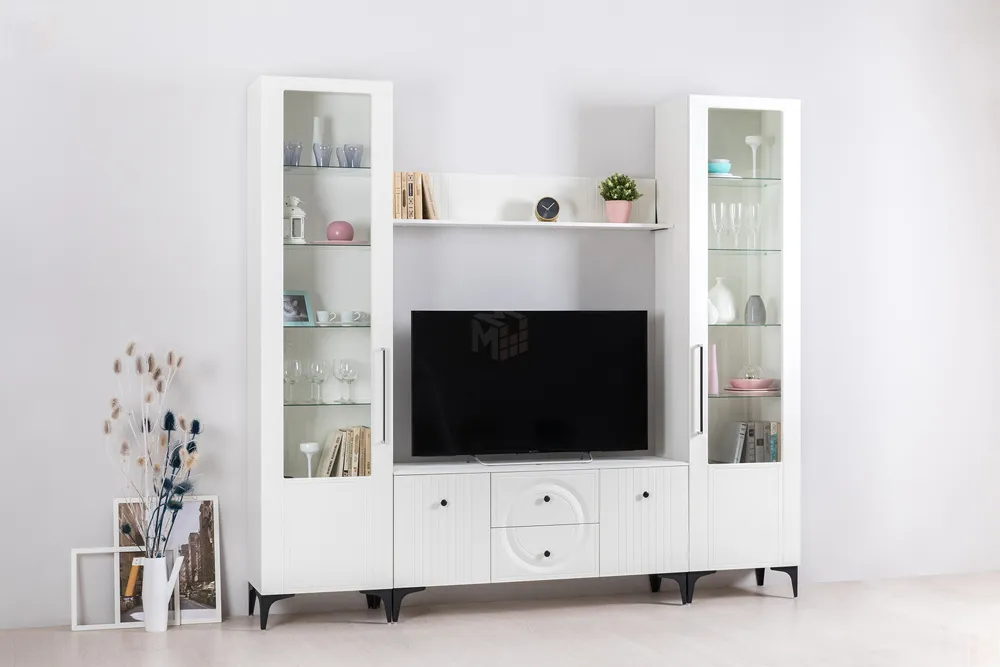 Светлая стильная гостиная Валенсия 1 в стиле ар-деко, логическое продолжение популярной спальни. Контрастное, графичное и стильное сочетание черного и хромированных деталей эффектно расставляет акценты на мебели. Геометричный рисунок фрезеровки даёт развитый светотеневой рисунок. Все выдвижные ящики и петли оснащены доводчиками.