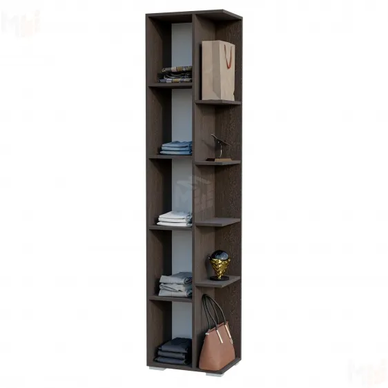 Пенал оснащён пятью закрытыми полками за створкой и пятью открытыми полками справа.