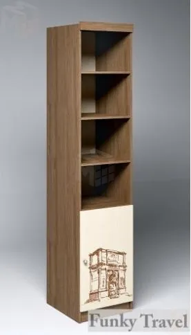 Пенал-стеллаж Фанки Тревел имеет четыре открытые полки для хранения книг или других вещей и закрытую фасадом полку с нанесенным на нее изображением триумфальной арки.