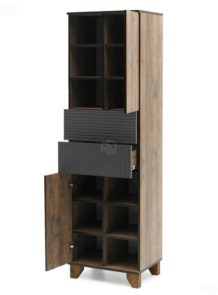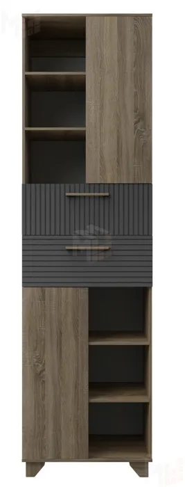 Шкаф-пенал — это отличный функциональный элемент для гостиной. Пенал оснащен открытыми полками и полками со створками, что позволяет хранить и предметы декора, и личные вещи, документы. Для плавности хода створок петли оснащены доводчиками. В конструкции пенала имеются ящики, оснащенные шариковыми направляющими полного выдвижения. Современная система «push-to-open» позволяет открывать створки нажатием руки. Ящики оснащены ручками из натурального массива дуба. Ножки, выполненные из массива дерева, имеют регулировку по высоте. Выбор цветов корпуса и фасада позволит найти удачный вариант для интерьера. -