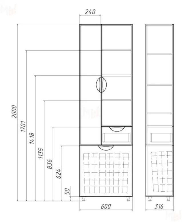 Пенал напольный "Грация" 60 с верхним ящиком В1 и корзиной для белья Домино.