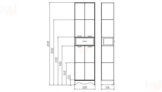 ширина 500 мм, глубина 316 мм, высота 2010 мм