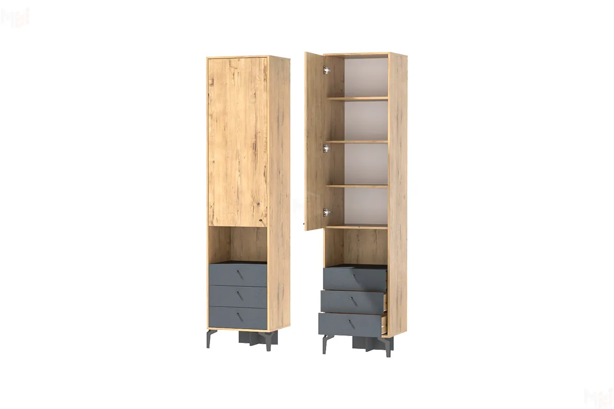 Современный пенал оснащен тремя выдвижными ящиками на шариковых направляющих полного выдвижения, открытыми и закрытыми нишами.