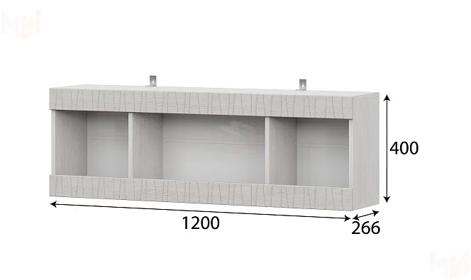 Модуль представляет собой открытую полку разделенную вертикальными перегородками на 3 отсека для хранения.