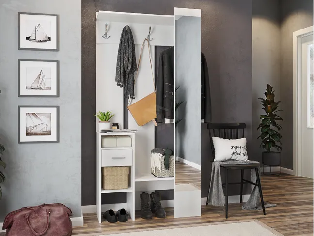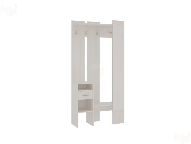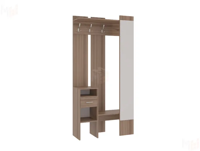 Мебель «Агата» создана для Вашей прихожей – Вы можете повесить одежду и сумку на металлические крючки, шляпки положить на полку сверху, нужные мелочи – в выдвижной ящик. На открытых полках можно разместить зонты, перчатки и шарфы. Лицевая панель с зеркалом во весь рост обеспечит комфорт и уют Вашей прихожей. Прихожая «Агата» - стильная, функциональная, занимает минимум пространства.