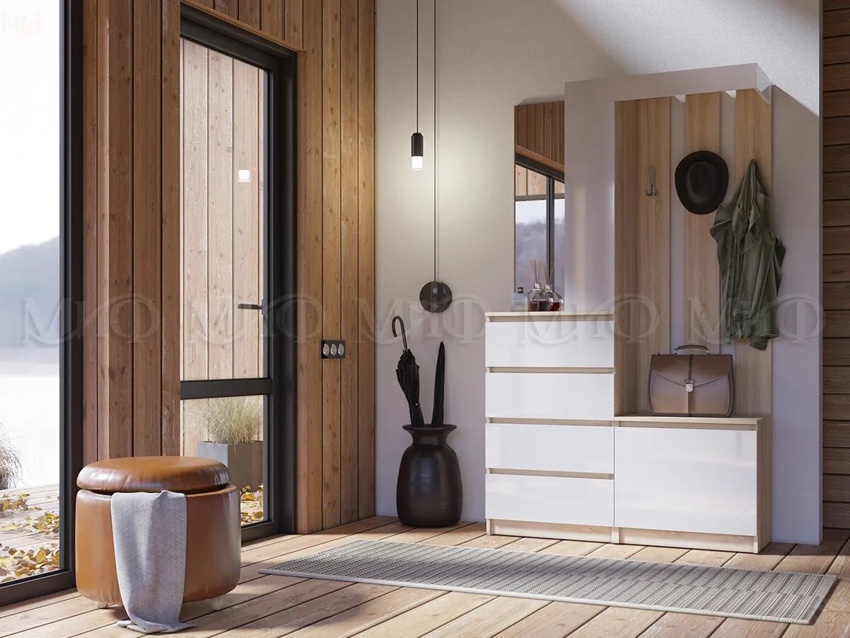 Корпус прихожей выполнен из ЛДСП цвета сонома 16 мм. Фасады ЛДСП белый глянец.