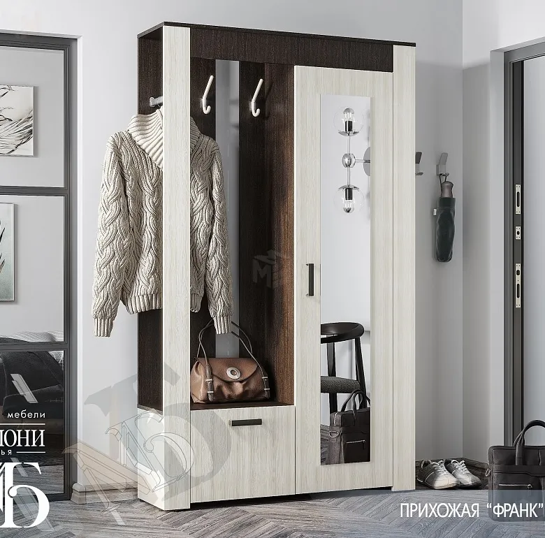Компактная и функциональная, прихожая «Франк» очаровательна в своей строгой элегантности и традиционности. В ней есть все, что необходимо – зеркало в полный рост, две распашных дверцы для хранения одежды и обуви и удобные крючки, расположенные на двух уровнях. Эта композиция идеально подойдет для небольших прихожих.