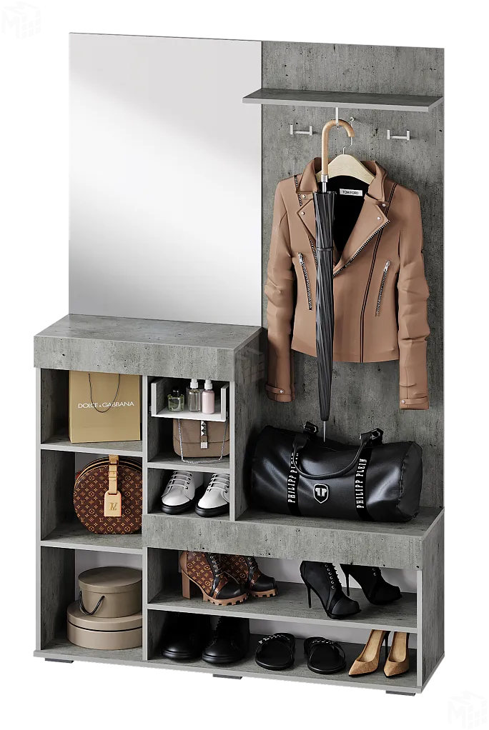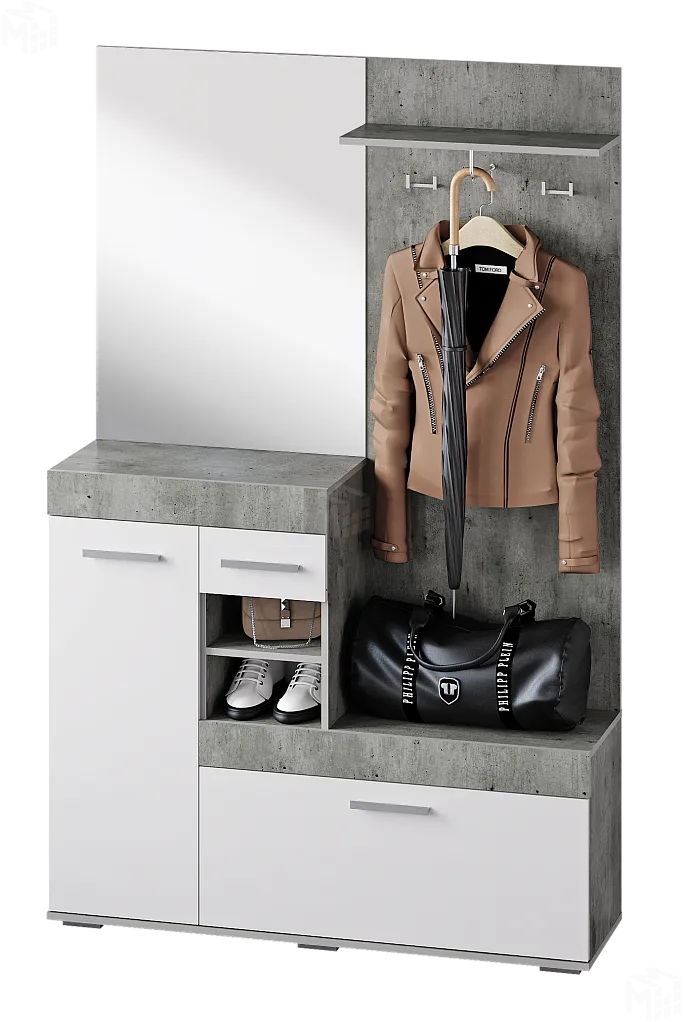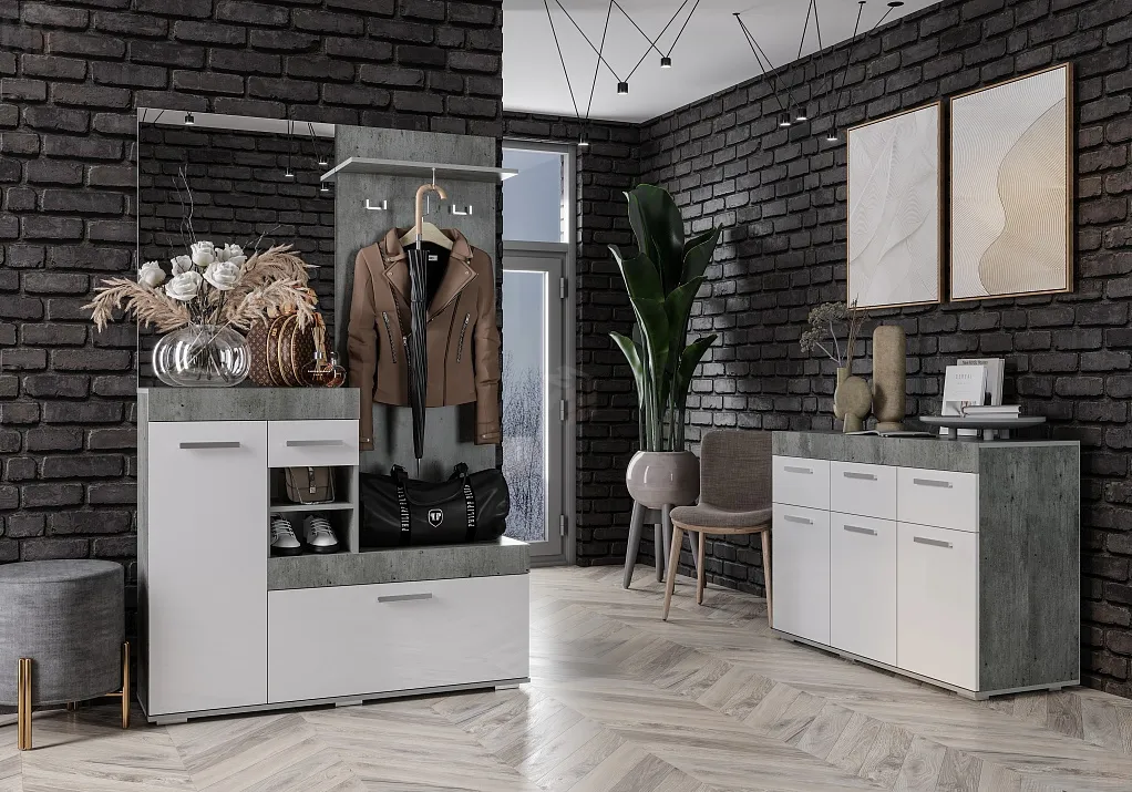 Прихожая «Инстайл» создана для разных интерьерных решений. Неоднородность структуры и холодные оттенки бетона идеально сочетаются с белым глянцевым декором, что позволяет создать уникальный интерьер без особого труда. Данная модель оснащена закрытыми ящиками, отсеками и иными элементами, обеспечивающими удобство хранения различных предметов гардероба. Важная деталь – зеркало облагороженное еврокромкой, которое придает изделию завершенность, четко подчеркивает, как его безопасность, так и презентабельность. Лаконичная простота конструкции, вместительность и очарование цветового решения – явные преимущества прихожей из модульной системы «Инстайл».