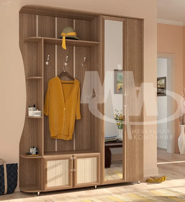 Вместительный шкаф прихожей Ксения-1 имеет две створки, одна из которых выполнена в виде зеркала в полный рост. Внутренне пространство шкафа обустроено максимально эффективно – полка и выдвижная штанга. Для обуви выделена закрытая полка, а для шляп – открытая широкая верхняя полка. Боковые миниатюрные полочки вместят предметы ухода, перчатки и прочие мелочи, которые необходимо держать под рукой, покидая дом. -