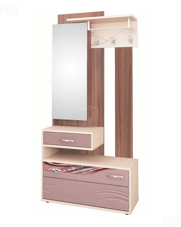 Ширина прихожей всего 1000 мм, но при этом на ней можно разместить: верхнюю одежду – на панели с крючками, головные уборы – на открытой полке, обувь – в закрытой тумбе, различные мелочи – на полках за зеркалом и в ящике.Цветовое исполнение:
