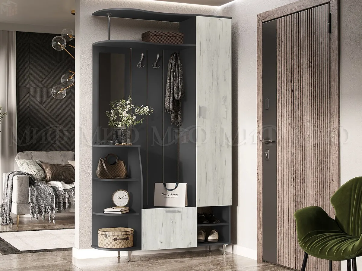 При своих небольших размерах прихожая Лика-2 вместила закрытый шкаф для хранения нескольких предметов верхней одежды, крючки для той же цели, вместительную верхнюю полку для шляп, боковые открытые полки для сумок и перчаток и два варианта мест хранения для мебели – открытые и закрытые полки. Кроме того, в шкафу обустроены ещё две дополнительных полки, которые можно использовать для шарфов, шапок и прочей галантереи. -