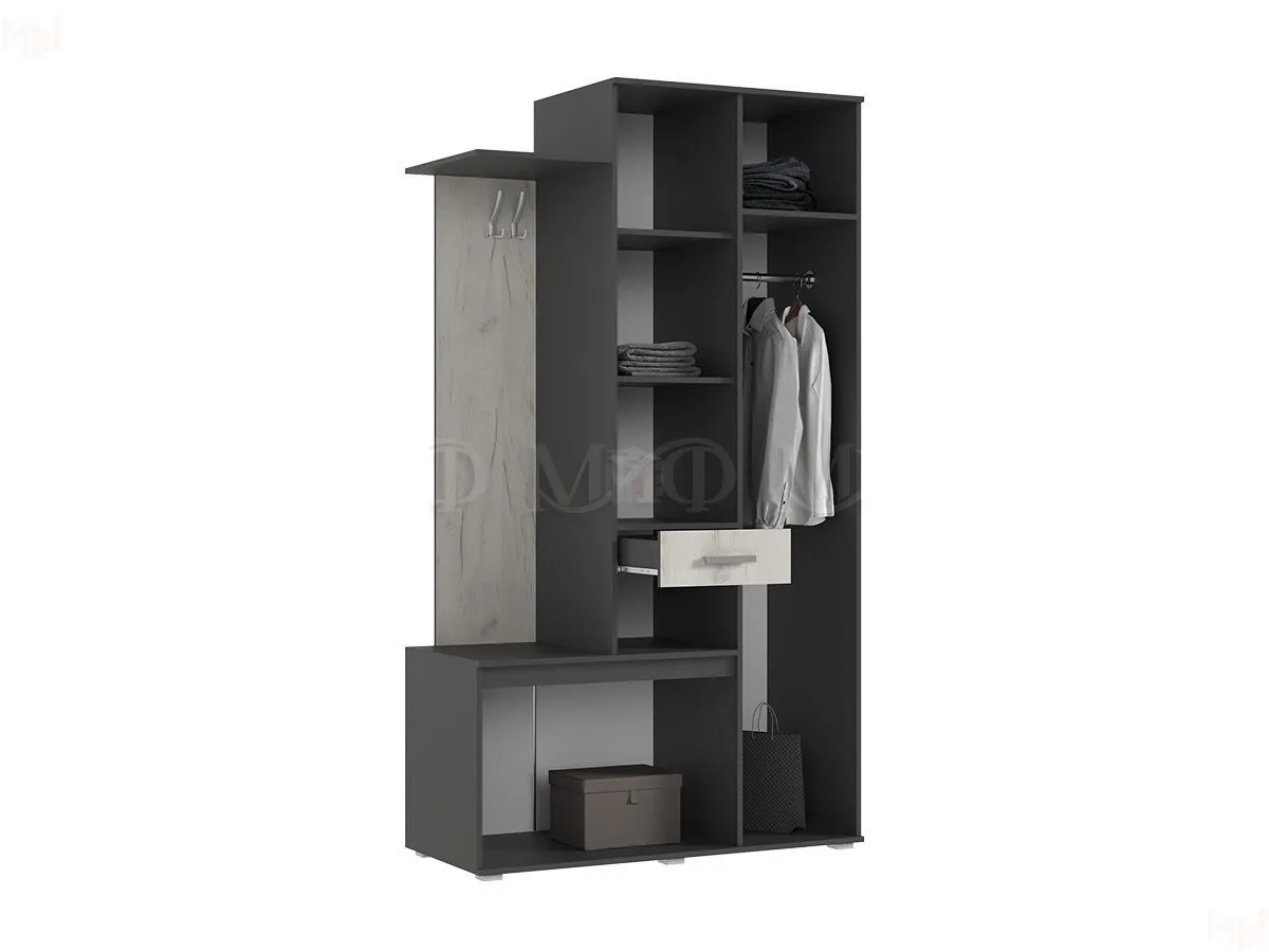 Прихожая состоит из нескольких составляющих - вместительный шкаф со штангой для верхней одежды, отделение для обуви, панель с вешалками.