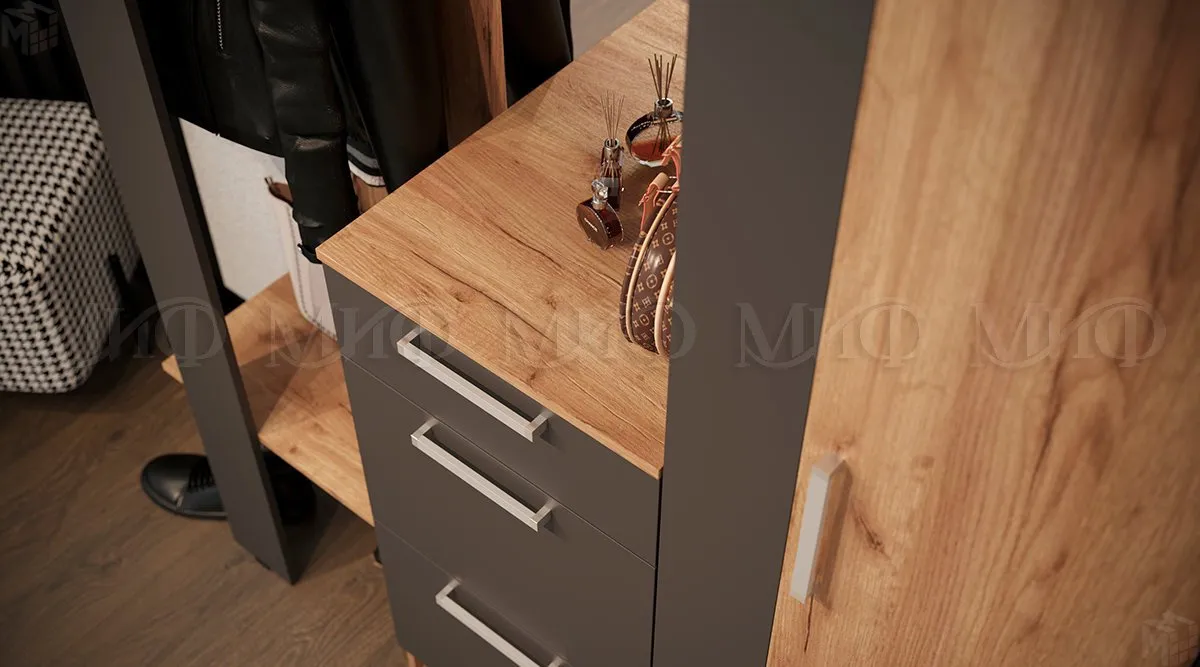 Прихожая выполнена в цвете крафт золотой/графит. -