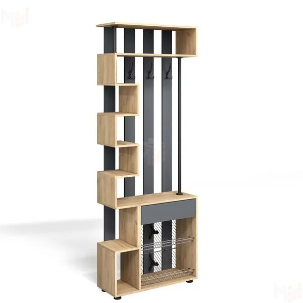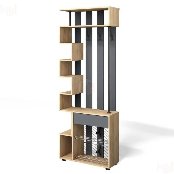 Современная и оригинальная прихожая Мини-Лайт МЛ-1 имеет ряд преимуществ. В этой модели сверху расположена полка для головных уборов, трехрожковые крючки-вешалки в количестве трех штук, сбоку оригинальный дизайн ниш для аксессуаров. Внизу удобная открытая обувница-пуфик, которая вмещает в себя до четырех пар обуви, а также выдвижной ящик для ключей или хранения мелочей.
