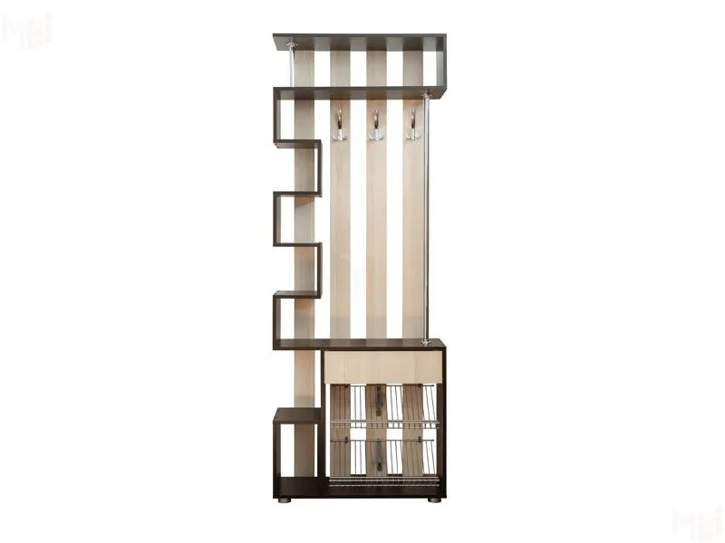 Современная и оригинальная прихожая Мини-Лайт МЛ-1 имеет ряд преимуществ. В этой модели сверху расположена полка для головных уборов, трехрожковые крючки-вешалки в количестве трех штук, сбоку оригинальный дизайн ниш для аксессуаров. Внизу удобная открытая обувница-пуфик, которая вмещает в себя до четырех пар обуви, а также выдвижной ящик для ключей или хранения мелочей.